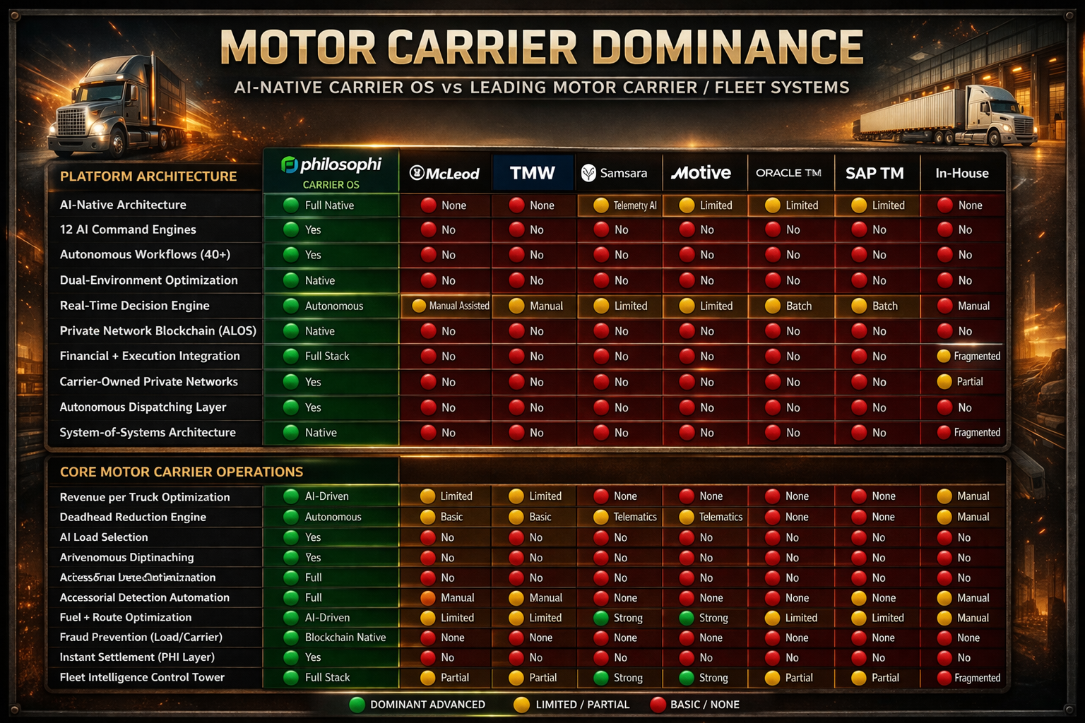 Philosophi Motor Carrier OS is not a TMS, dispatch system, or fleet management tool—it is a sovereign, AI-native operating system engineered to run, optimize, and scale your entire fleet as an intelligent, autonomous revenue network. This is the control layer carriers have never had.