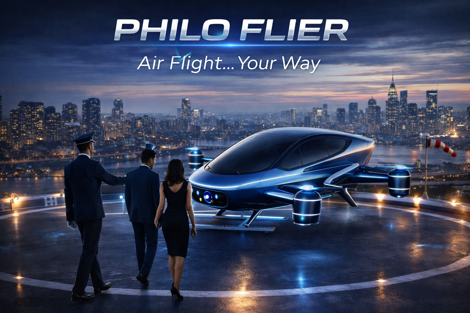With one app, you choose how you move. Prefer the reassurance of a professional driver? Select a human-driven PHILO Cab. Want a fully autonomous, quiet ride across the city? Choose an AI-powered PHILO Cab. Need to bypass traffic entirely? Step into a PHILO Flier and lift above the congestion with our electric VTOL air taxis—designed for speed, safety, and breathtaking efficiency.